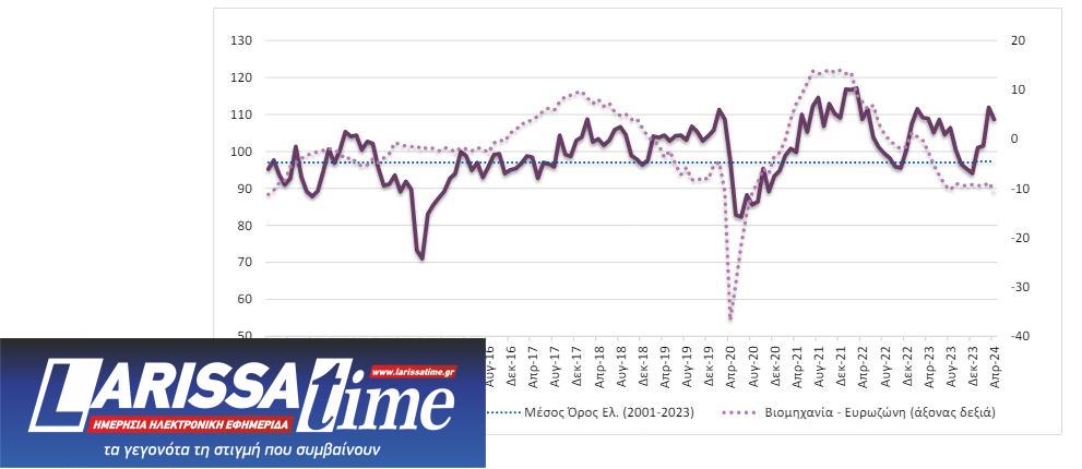 Χαμηλότερα κινήθηκε ο Δείκτης Επιχειρηματικών Προσδοκιών στη Βιομηχανία τον Απρίλιο καθώς διαμορφώθηκε στις 108,7 μονάδες (από 111,9 μον. ένα μήνα πριν), σε οριακά χαμηλότερο επίπεδο από το αντίστοιχο περυσινό (108,9 μον.) όπως προκύπτει από το Μηνιαίο Δελτίο Εξελίξεων στη Βιομηχανία (Μάιος 2024) του ΙΟΒΕ.