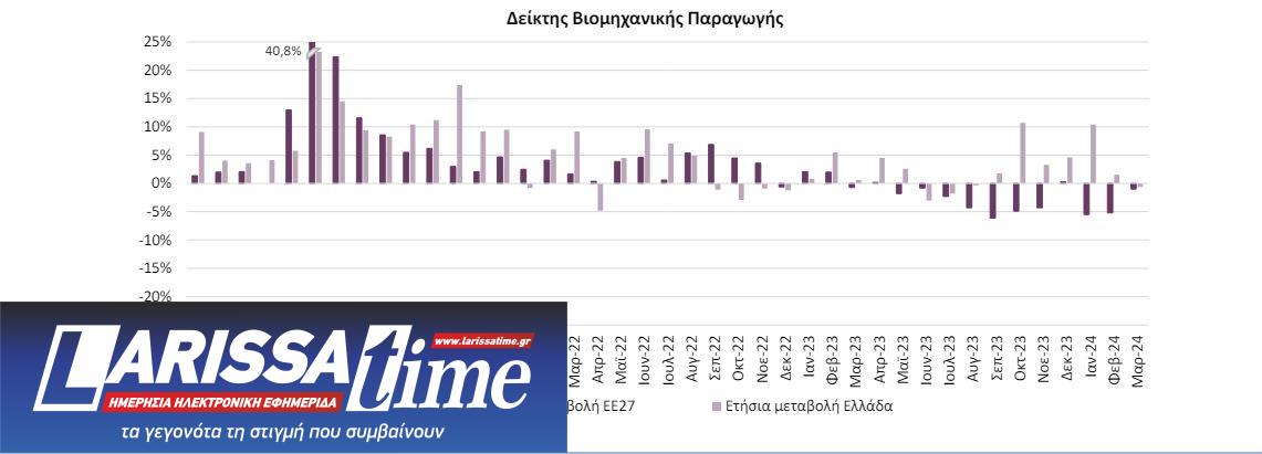 Η βιομηχανική παραγωγή στην χώρα μας σημείωσε ήπια υποχώρηση κατά 0,6% τον Μάρτιο σε σχέση με ένα έτος πριν, όταν στην ΕΕ των 27 μειώθηκε κατά 1,0%. Πιο συγκεκριμένα επικράτησαν μεικτές τάσεις στους κλάδους της βιομηχανίας, με ενίσχυση στο Ηλεκτρικό Ρεύμα (8,2%), αλλά εξασθένιση σε Ορυχεία – Λατομεία (-2,5%) και Μεταποίηση (-2,2%). Σε κλάδους υψηλής σημασίας για την ελληνική οικονομία, άνοδος καταγράφηκε στα Τρόφιμα (2,2%), αλλά υποχώρηση σε Φάρμακα (-9,7%) και Βασικά Μέταλλα (-2,1%).