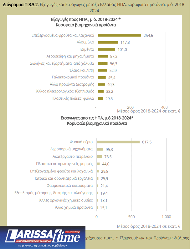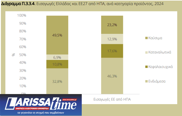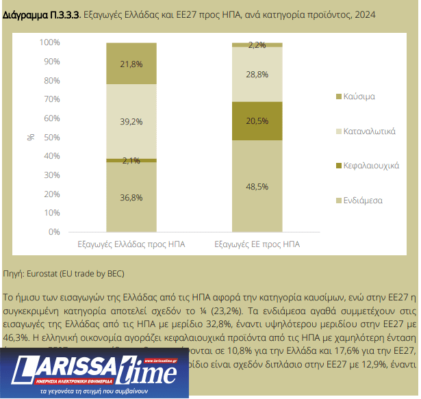 επηρεάσουν τις εξαγωγές. Στο σκέλος των εισαγωγών, εκτός από το φυσικό αέριο και το πετρέλαιο, η Ελλάδα εισάγει αεροπορικά μηχανήματα, πλαστικά, φρούτα, ιατρικά εργαλεία και φαρμακευτικά σκευάσματα, τα περισσότερα από τα οποία θα επηρεαστούν από την επιβολή των δασμών. Ανά κατηγορία προϊόντος, οι εξαγωγές της ελληνικής οικονομίας προς τις ΗΠΑ, αφορούν καταναλωτικά, ενδιάμεσα προϊόντα και καύσιμα και πολύ λιγότερο κεφαλαιουχικά, ενώ στις εισαγωγές κυριαρχούν τα καύσιμα και ακολουθούν τα ενδιάμεσα προϊόντα.