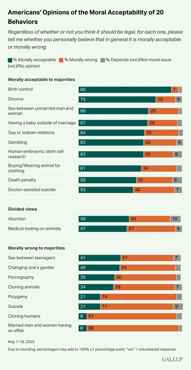 Λιγότερο από το ήμισυ των Ρεπουμπλικάνων και των Δημοκρατικών πιστεύουν ότι επτά πράξεις είναι ηθικά αποδεκτές: η πορνογραφία, η αυτοκτονία, η πολυγαμία, η κλωνοποίηση ζώων, οι εξωσυζυγικές σχέσεις, οι ιατρικές δοκιμές σε ζώα και η κλωνοποίηση ανθρώπων