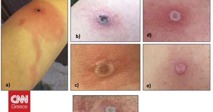 Τα συμπτώματα περιλαμβάνουν συνήθως μία ή περισσότερες δερματικές αλλοιώσεις που αρχικά μοιάζουν με δάγκωμα αράχνης. Μπορούν επίσης να εμφανιστούν διογκωμένοι λεμφαδένες, μυϊκός πόνος και πυρετός.