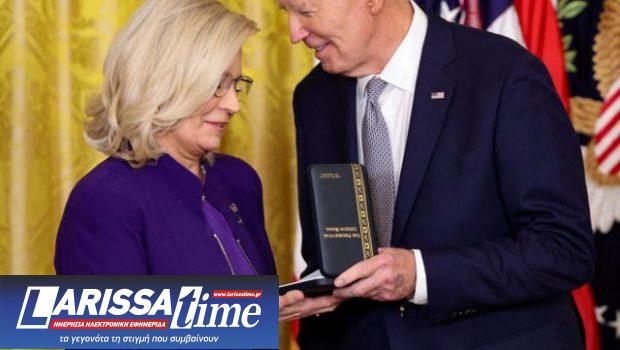 Ο Τζο Μπάιντεν παρασημοφόρησε χθες Πέμπτη, υπό παρατεταμένες επευφημίες, την πρώην βουλευτή των Ρεπουμπλικάνων Λιζ Τσέινι, πολέμια του εκλεγμένου προέδρου Ντόναλντ Τραμπ, που την έχει προειδοποιήσει πως ενδέχεται να βρεθεί αντιμέτωπη με «μεγάλα προβλήματα» με τη δικαιοσύνη αφού αναλάβει τα καθήκοντά του, την 20ή Ιανουαρίου (φωτογραφία, επάνω, από το Reuters/Kevin Lamarque).