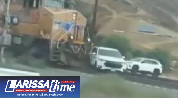 Το αυτοκίνητο που επέβαιναν κόλλησε στις ράγες και κατάφεραν να σωθούν δευτερόλεπτα πριν τη σύγκρουση.