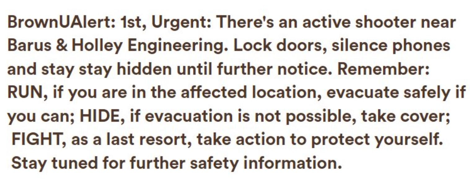 Το μήνυμα ζητά από φοιτητές και διδακτικό προσωπικό να είναι σε εγρήγορση καθώς υπάρχει «ενεργός σκοπευτής», δηλαδή περιστατικό με πυροβολισμούς σε εξέλιξη. Το μήνυμα ζητά από τα άτομα να κλειδωθούν στις αίθουσες που βρίσκονται, να γυρίσουν τα κινητά τους στο αθόρυβο και να περιμένουν περισσότερες πληροφορίες.