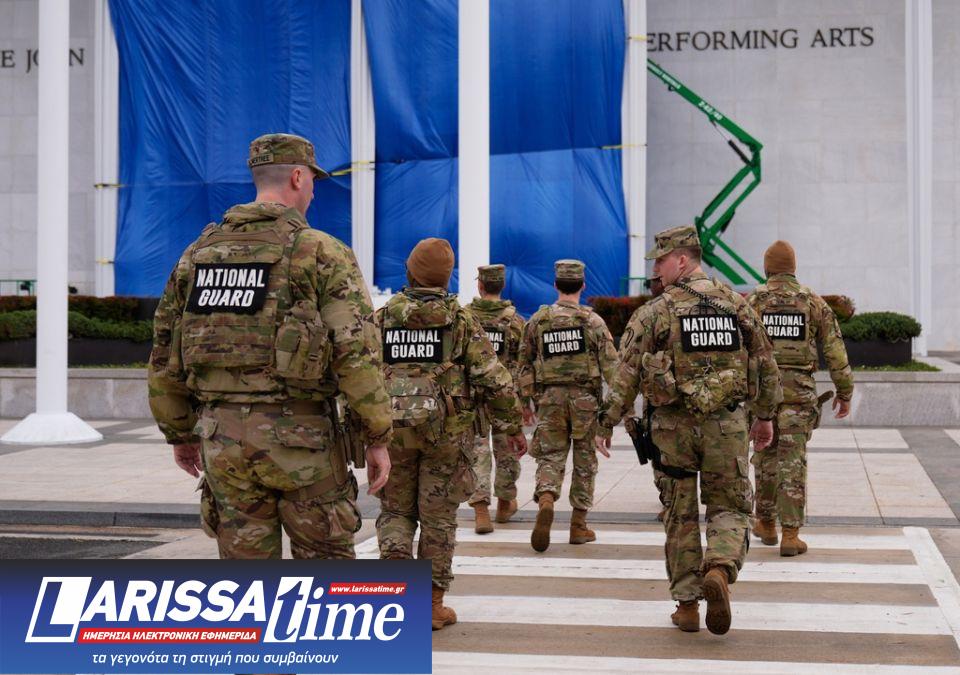 Στρατιώτες της Εθνοφρουράς περπατούν προς το Κέντρο Κένεντι καθώς γίνονται εργασίες για την αλλαγή της επιγραφης στο εξωτερικό του Κέντρου Κένεντι, Παρασκευή 19 Δεκεμβρίου 2025, στην Ουάσινγκτον.