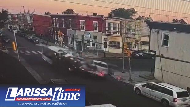 Σοκαριστικό τροχαίο σημειώθηκε την Κυριακή στη Φιλαδέλφεια των ΗΠΑ, με σφοδρότατη σύγκρουση δύο οχημάτων, που καταγράφηκε από τις κάμερες ασφαλείας.