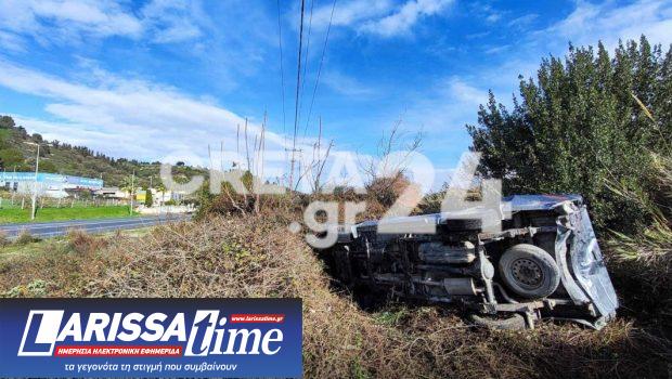 Μετά τη σύγκρουση, το αγροτικό εξετράπη της πορείας του και ανετράπη με συνέπεια οδηγός και συνοδηγός να εγκλωβιστούν