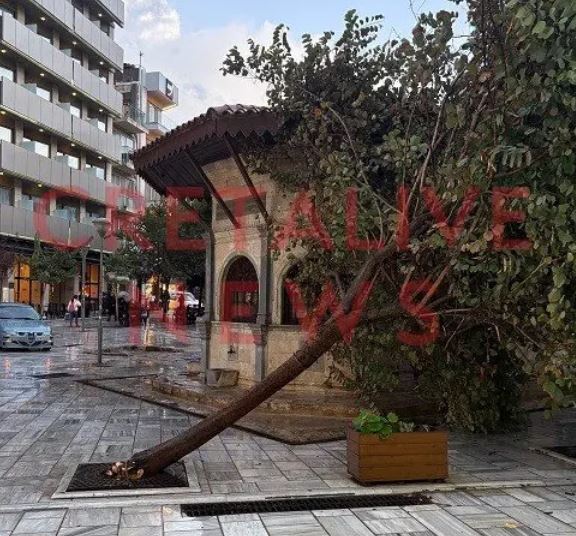 Από την Πολιτική Προστασία του Δήμου Ηρακλείου έγινε λόγος για πτώσεις δύο δέντρων και προστατευτικών κάγκελων πεζοδρομίου, ενώ τα σημεία έχουν αποκλειστεί.