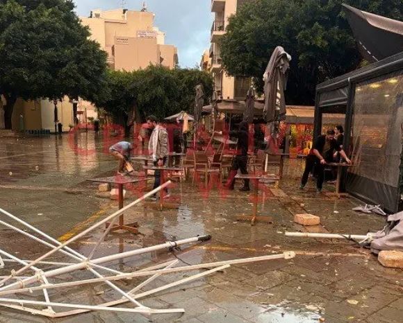 Αναγνώστες ανέφεραν ότι, ενώ ψιχάλιζε, άρχισε να πιάνει δυνατός αέρας ο οποίος ξαφνικά «σήκωσε» τις καρέκλες σε καφετέρια στην περιοχή του Αγ. Μηνά. Οι σερβιτόροι έσπευσαν να προφυλάξουν τους θαμώνες καλώντας τους να μπουν μέσα στο μαγαζί, κλείνοντας και την τζαμαρία.