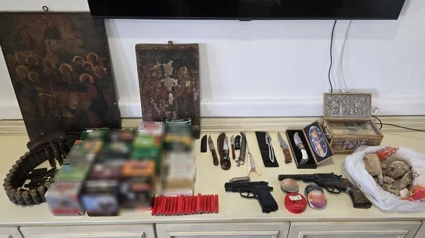 Σύμφωνα με το cretalive, η υπόθεση αποκαλύφθηκε το Μεγάλο Σάββατο (11/4) ύστερα από καταγγελία μίας 52χρονης, με τους αστυνομικούς να εντοπίζουν κατά τις έρευνες καραμπίνες, αεροβόλα, μαχαίρια, κροτίδες ακόμη και… οστεοφυλάκιο με λείψανα.