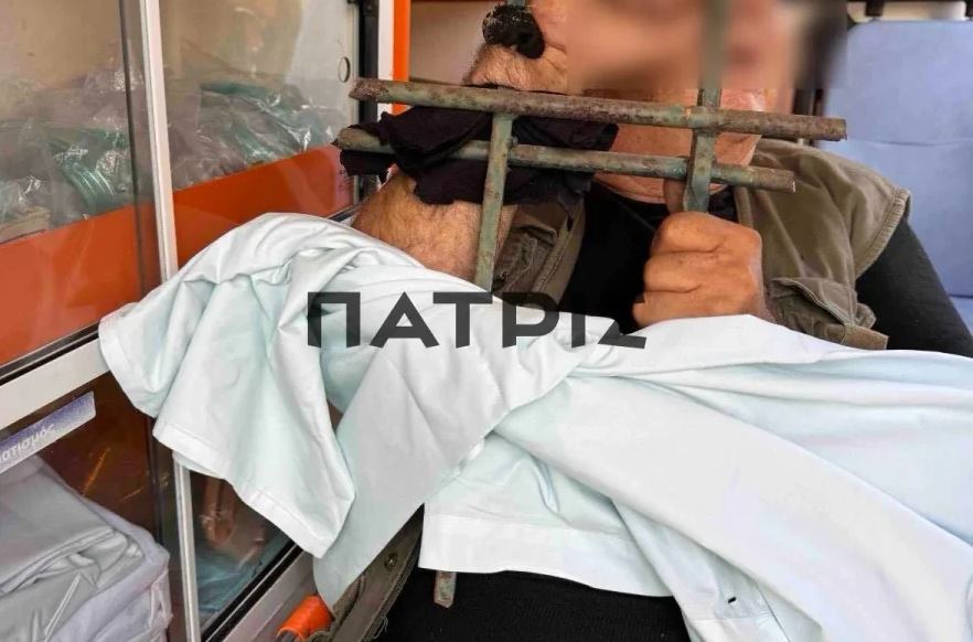 Οι διασώστες της ΕΜΑΚ έκοψαν το σίδερο επιτόπου, ώστε να διασφαλιστεί η ασφαλής μεταφορά του ηλικιωμένου, χωρίς να επιδεινωθεί ο τραυματισμός του.