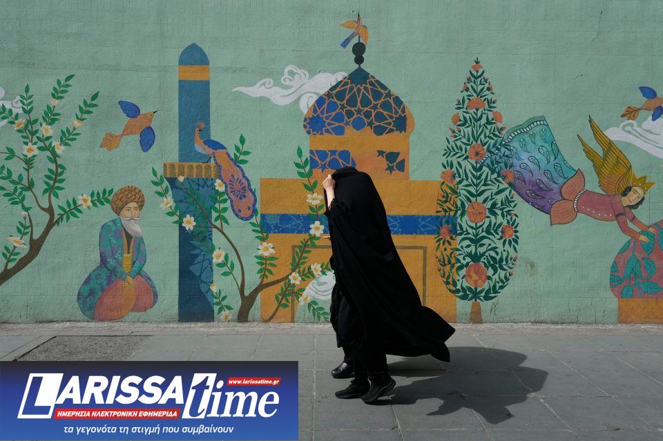 Γυναίκες καλυμμένες από την κορυφή μέχρι τα νύχια περνούν μπροστά από μια τοιχογραφία που απεικονίζει ένα τζαμί στην οδό Ισλαμικής Επανάστασης, στο κέντρο της Τεχεράνης, στο Ιράν, το Σάββατο 25 Απριλίου 2026.