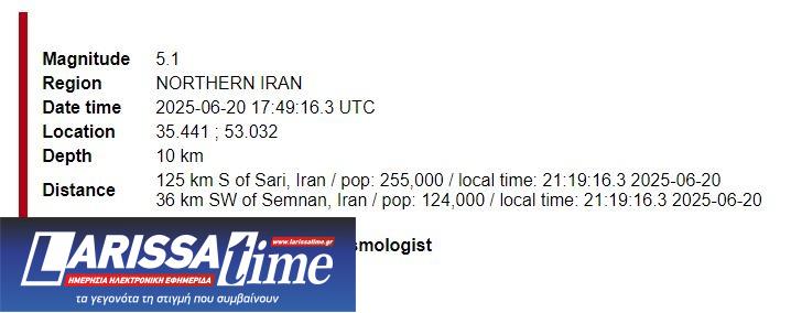 Σεισμός μεγέθους 5,1 Ρίχτερ σημειώθηκε κοντά στην ιρανική πόλη Κομ (έβδομη μεγαλύτερη μητρόπολη και επίσης η 7η μεγαλύτερη πόλη της χώρας) που βρίσκεται περίπου 140 χιλιόμετρα νότια της Τεχεράνης.