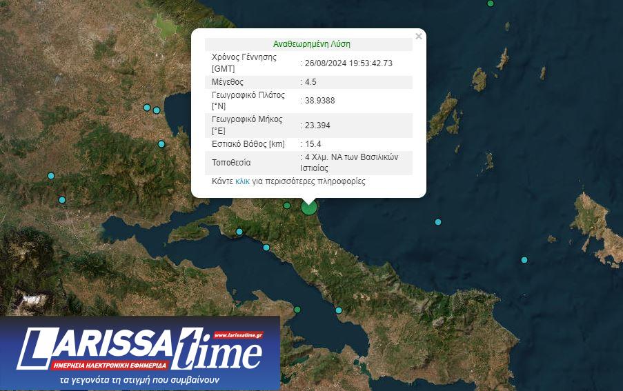 Το επίκεντρο της δόνησης εντοπίζεται στην Εύβοια και συγκεκριμένα 4 Χλμ. νοτιοανατολικά των Βασιλικών Ιστιαίας, ενώ το εστιακό βάθος ήταν στα 15,4 χιλιόμετρα.