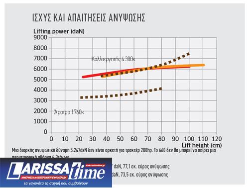 Σε σύγκριση µε τη δοκιµή του 2016 στο 650, η Claas έχει φέρει πιο ψηλά τον άξονα διασταύρωσης και το πάνω σηµείο ζεύξης στον πίσω σύνδεσµο για βελτιωµένη ανυψωτική ικανότητα. Εντούτοις, µια διαρκής ανυψωτική ισχύς ακριβώς 5.247daN, όπως µετρήθηκε στη δοκιµή µας στο DLG, δεν επαρκεί για να σηκώσει µια σβάρνα 4,3τ (δες, στο πάνω γράφηµα, Ισχύς και Απαιτήσεις Ανύψωσης).
