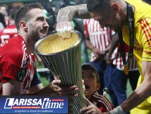 Ο μικρός Γιαννάκης σηκώνει το τρόπαιο μαζί με τους παίκτες του Ολυμπιακού.