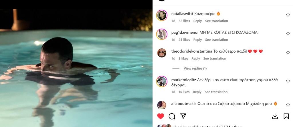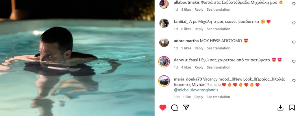 «Εγώ σας χαιρετάω από τα πατώματα», «ο κούκλος μας !!!Σε λατρεύωωω να περνάς τέλεια», «η Παναγιά το έστειλε αυτό», «Vacancy mood…!!Νew Look..!!Ωραίος…!!Καλές διακοπές Μιχάλη!!!», «ποιος είπαμε μας συνεφέρει μετά από αυτό?», «Γίνομαι το χλώριο σου», «Δεν ξέρω αν αυτό είναι πρόταση γάμου αλλά δέχομαι» ήταν κάποια από τα αμέτρητα σχόλια στη φωτογραφία που δροσίζεται στην πισίνα.