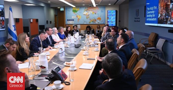 «Ενημέρωση σήμερα στο ισραηλινό ΥΠΕΞ για Πρέσβεις ενόψει της Τελετής του Αγίου Φωτός, υπό την καθοδήγηση του Αναπληρωτή Γενικού Διευθυντή Δημόσιας Διπλωματίας Γιακόβ Λίβνε και του Επικεφαλής Πρωτοκόλλου Γκιλ Χάσκελ.
