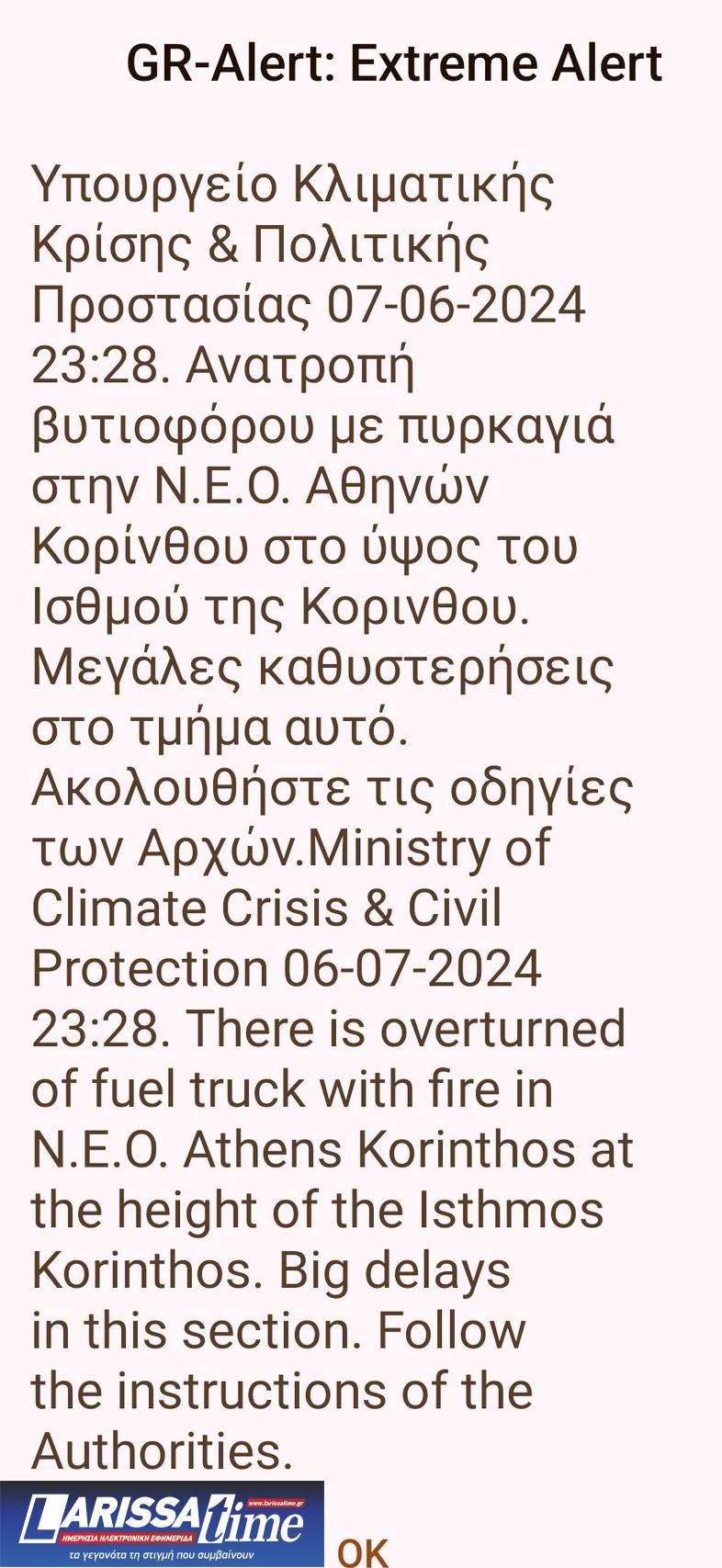 Συγκεκριμένα το μήνυμα αναφέρει: «Υπουργείο Κλιματικής Κρίσης & Πολιτικής Προστασίας 07-06-2024 23:28. Ανατροπή βυτιοφόρου με πυρκαγιά στην Ν.Ε.Ο. Αθηνών Κορίνθου στο ύψος του Ισθμού της Κορινθου. Μεγάλες καθυστερήσεις στο τμήμα αυτό. Ακολουθήστε τις οδηγίες των Αρχών».