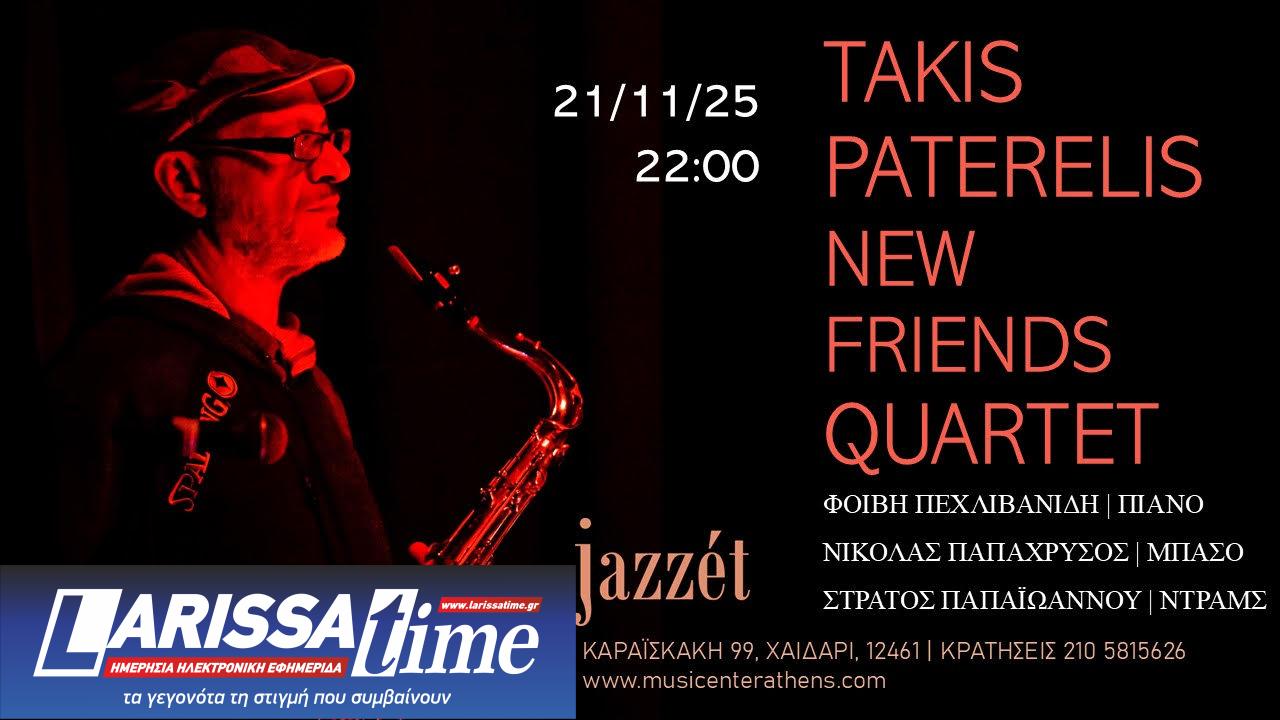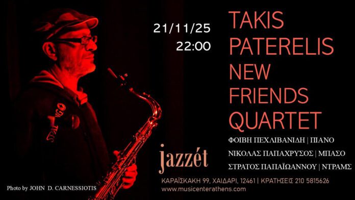 Το Jazzèt φιλοξενεί στις 21 Νοεμβρίου του 2025 στις 22:00 τον σπουδαίο σαξοφωνίστα Τάκη Πατερέλη με το New Friends Quartet, σε μια συναυλία που υπόσχεται μια αυθεντική εμπειρία σύγχρονης τζαζ γεμάτη ρυθμό, διάλογο και δημιουργική ένταση.