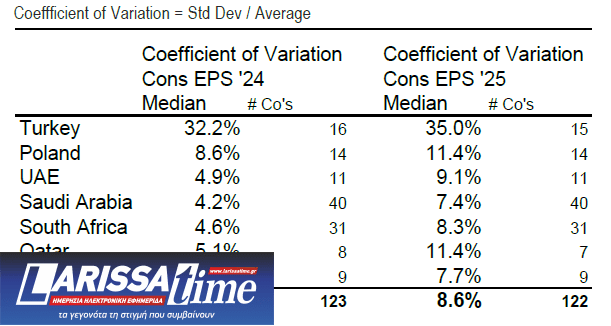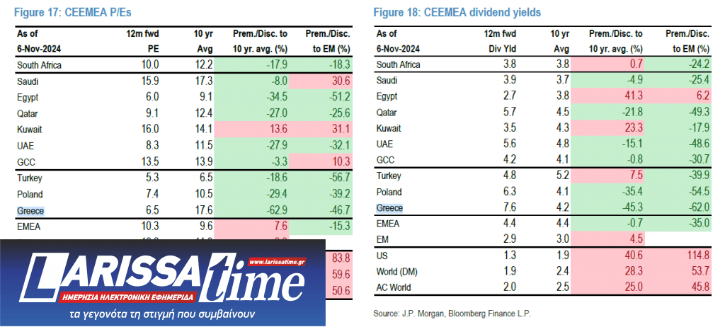 Επιπλέον, η JP Morgan δηλώνει OW στην Ελλάδα έναντι της Πολωνίας, στην περιοχή CEEMEA (Κεντρικής και Ανατολικής Ευρώπης, Μέσης Ανατολής και Αφρικής), καθώς η χώρα έχει λιγότερη έκθεση στον ευρωπαϊκό μεταποιητικό τομέα και τα προβλήματα που μπορεί να προκύψουν στο παγκόσμιο εμπόριο, ενώ έχει και λιγότερη έκθεση σε θέματα Ουκρανίας/ασφάλειας. ![]()