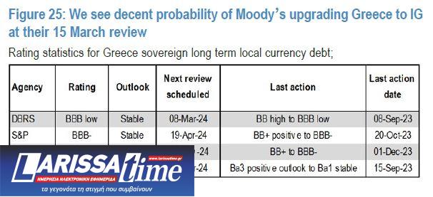 Όπως αναφέρει η JP Morgan, στις 15 Μαρτίου, η Moody’s πρόκειται να αναθεωρήσει την αξιολόγηση της Ελλάδας και υπάρχει «αξιοπρεπής» πιθανότητα να της δώσει την επενδυτική βαθμίδα (IG). Η Moody’s είναι ο μόνος μεγάλος οίκος αξιολόγησης που εξακολουθεί να έχει την Ελλάδα χωρίς την επενδυτική βαθμίδα.