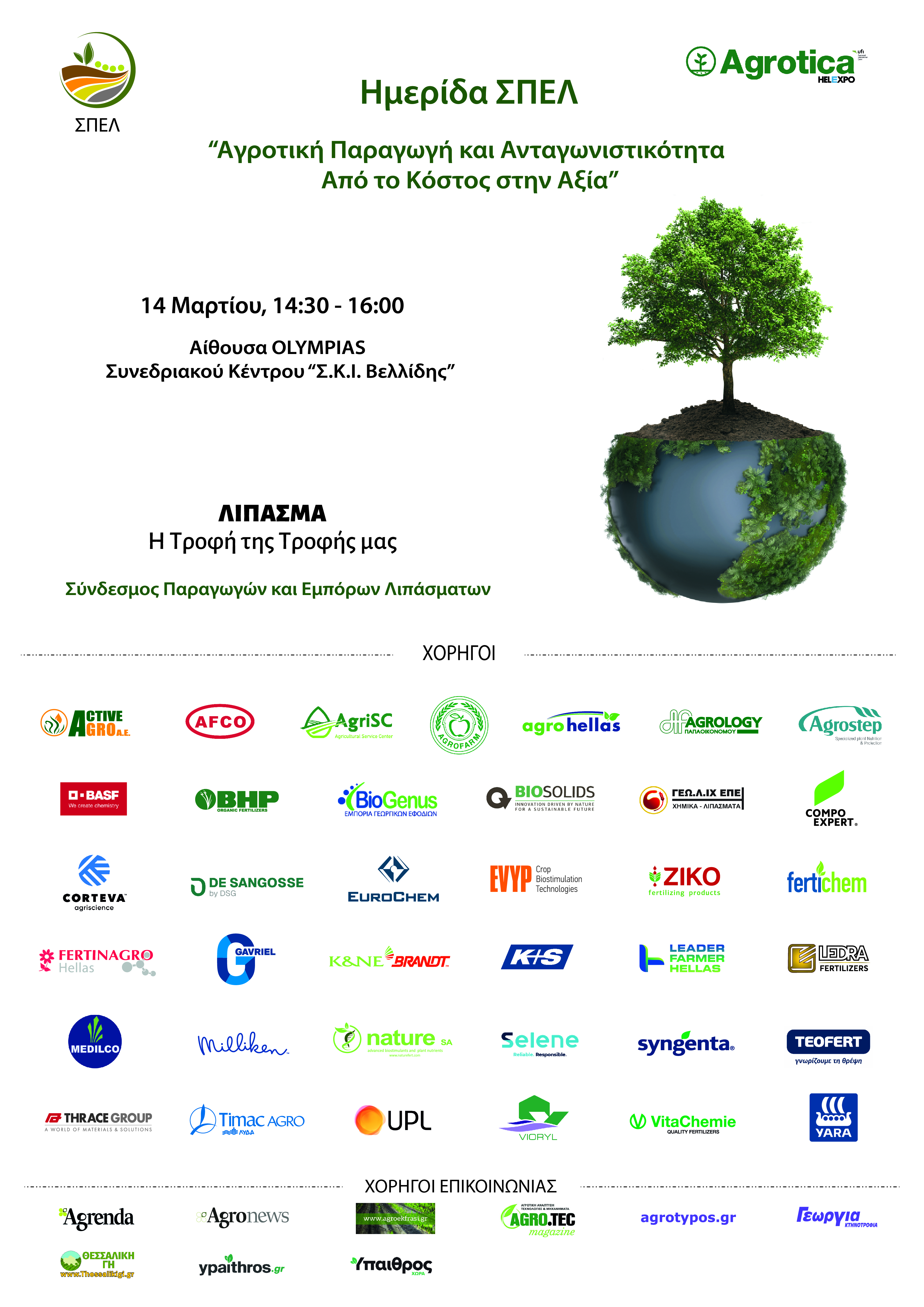 Στο επίκεντρο της παρουσίας του ΣΠΕΛ στην Agrotica 2026 βρίσκεται η Ημερίδα που διοργανώνει το Σάββατο 14 Μαρτίου 2026 (14:30 – 16:00), στην Αίθουσα OLYMPIAS του Συνεδριακού Κέντρου «Σ.Κ. Ι. Βελλίδης», με θέμα «Αγροτική Παραγωγή και Ανταγωνιστικότητα: Από το Κόστος στην Αξία».