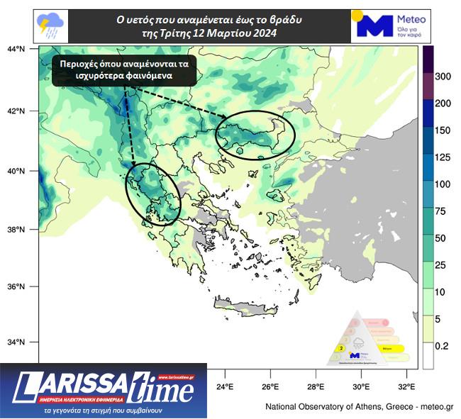 Σύμφωνα με την κατηγοριοποίηση των επεισοδίων βροχόπτωσης (Regional Precipitation Index), η οποία εφαρμόζεται από τη μονάδα Meteo του Εθνικού Αστεροσκοπείου Αθηνών, το επεισόδιο βροχόπτωσης για την Τρίτη 12/03 κατατάσσεται στην κατηγορία 2 (Μέτρια).