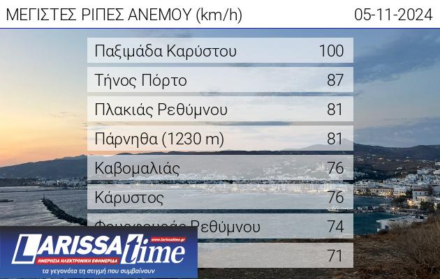 Στο Πόρτο της Τήνου οι μέγιστες ριπές έφτασαν τα 87 χλμ/ώρα, στον Πλακιά Ρεθύμνου και στην Πάρνηθα (1230) τα 81 χλμ/ώρα.