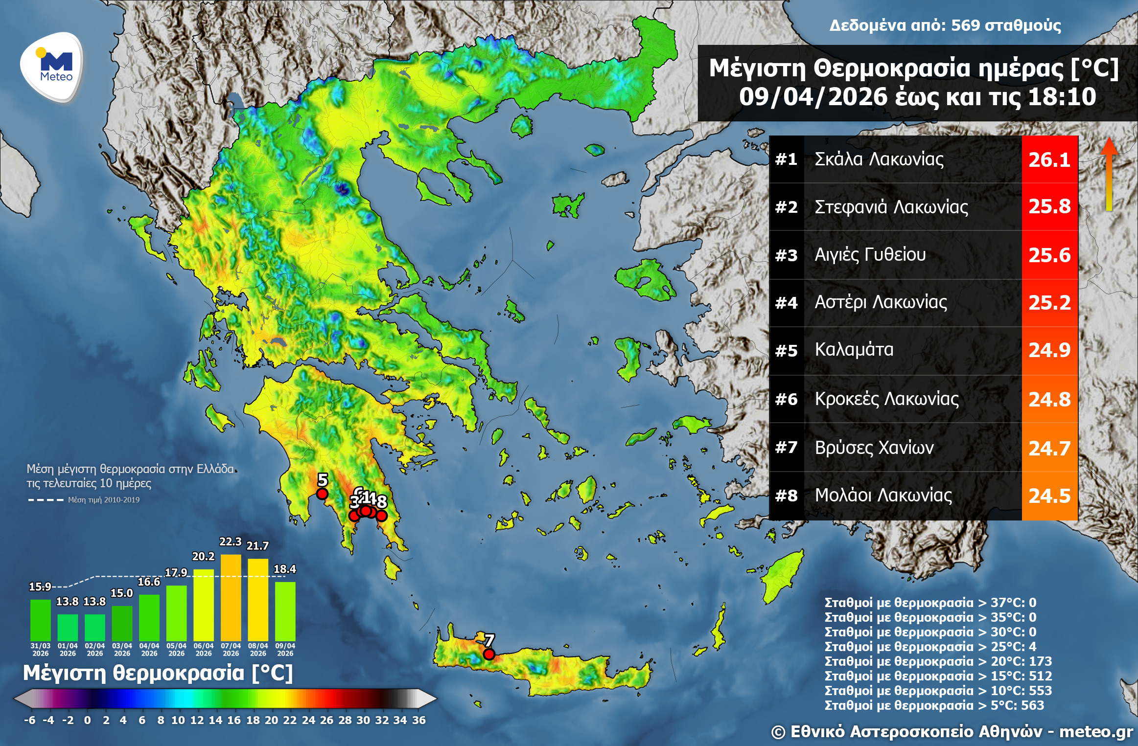 Στον παρακάτω χάρτη παρουσιάζονται οι μέγιστες θερμοκρασίες στη χώρα μας έως τις 18:10 της Μ. Πέμπτης 09 Απριλίου 2026, ενώ στον πίνακα παρουσιάζονται οι 8 υψηλότερες μέγιστες θερμοκρασίες.