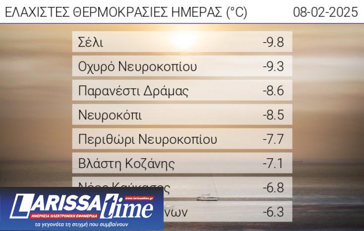Συγκεκριμένα, σύμφωνα μα το δίκτυο αυτόματων μετεωρολογικών σταθμών του Εθνικού Αστεροσκοπείου Αθηνών / meteo.gr, ο υδράργυρος στο Σέλι έπεσε στους -9,8 βαθμούς Κελσίου.