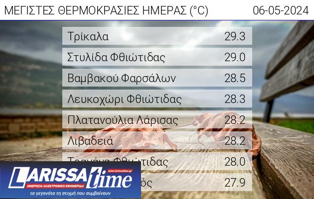 Σύμφωνα με το meteo.gr, η μέγιστη θερμοκρασία σημειώθηκε στο μετεωρολογικό σταθμό στα Τρίκαλα και ήταν ίση με 29.3 βαθμούς Κελσίου. Ακολούθησαν η Στυλίδα Φθιώτιδας με 29 βαθμούς και η Βαμβακού Φαρσάλων με 28.5 βαθμούς Κελσίου.