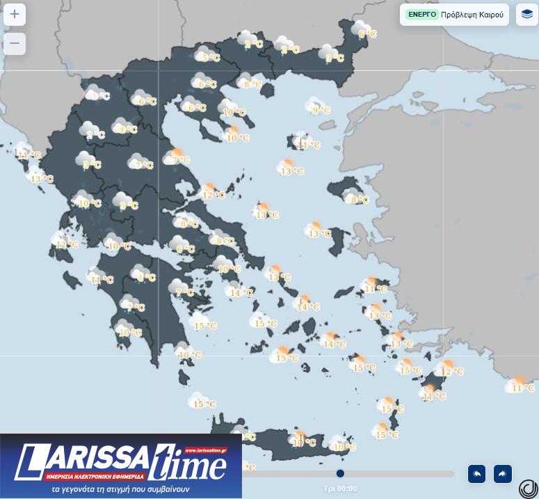 Η θερμοκρασία θα σημειώσει μικρή πτώση στα βορειοανατολικά και θα φτάσει στα βόρεια τους 11 με 13 βαθμούς και στην υπόλοιπη χώρα τους 15 με 17 και κατά τόπους στα νότια τους 18 βαθμούς Κελσίου.