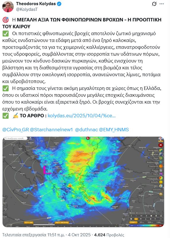 Για την μεγάλη αξια των φθινοπωρινών βροχών έγραψε σήμερα (04/10) σε ανάρτησή του ο μετεωρολόγος Θαδωρής Κολυδάς, καθώς και στην προοπτική του καιρού για τις επόμενες ημέρες.