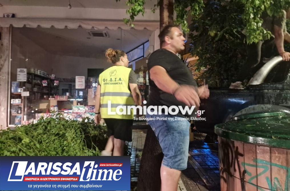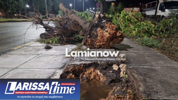 Η εικόνα του ξεριζωμένου τεράστιου δέντρου στο ύψος της ΔΕΥΑΛ (κεντρική φωτογραφία) αποτυπώνει τη δύναμη αυτής της καταιγίδας, που ήταν ικανή να προκαλέσει πολύ σοβαρότερες ζημιές, αναφέρει το lamianow.gr.