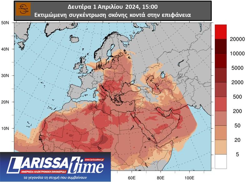 Χάρτης με τις εκτιμώμενες συγκεντρώσεις σκόνης κατά τις μεσημεριανές ώρες της Δευτέρας 01/04, όπως υπολογίζονται από το αριθμητικό μοντέλο πρόγνωσης συγκέντρωσης σκόνης
