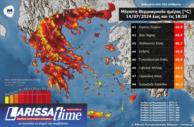 Όπως φαίνεται στον χάρτη που ακολουθεί, η μέγιστη θερμοκρασία καταγράφηκε στην Κερκίνη Σερρών, καθώς άγγιξε σχεδόν τους 41 βαθμούς Κελσίου – η θερμοκρασία ήταν ίση με 40.9 °C.