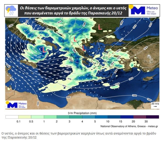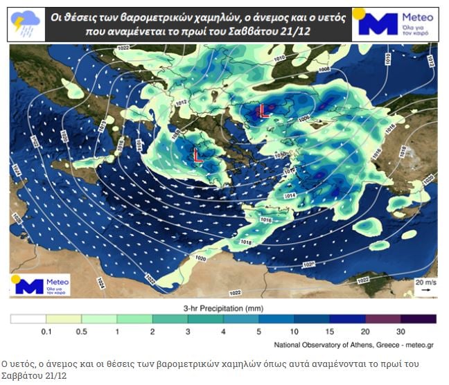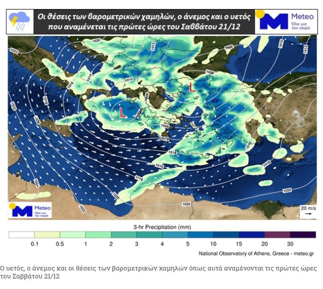 Στους χάρτες που ακολουθούν παρουσιάζεται ο υετός, ο άνεμος και οι θέσεις των βαρομετρικών χαμηλών όπως αυτά αναμένονται αργά το βράδυ της Παρασκευής 20/12, τις πρώτες ώρες του Σαββάτου 21/12 καθώς και το πρωί του Σαββάτου 21/12.