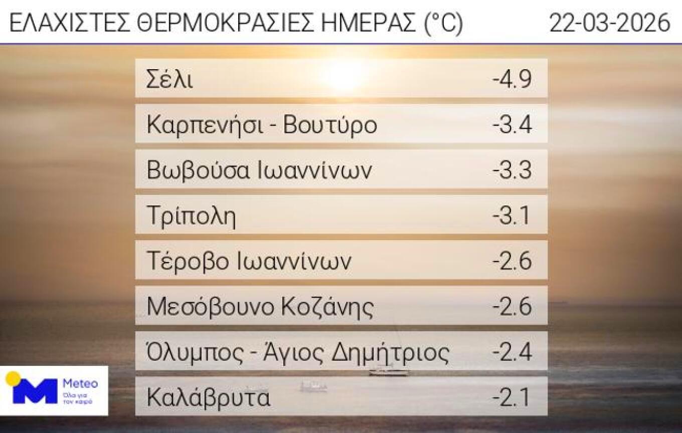 Την ίδια ώρα, ιδιαίτερα χαμηλές θερμοκρασίες καταγράφηκαν το πρωί της Κυριακής 22 Μαρτίου, με τον υδράργυρο να πλησιάζει τους -5°C. Σύμφωνα με το δίκτυο αυτόματων μετεωρολογικών σταθμών του meteo.gr / Εθνικού Αστεροσκοπείου Αθηνών, η χαμηλότερη θερμοκρασία σημειώθηκε στο Σέλι και ήταν -4,9°C.