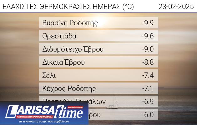 Σύμφωνα με το δίκτυο αυτόματων μετεωρολογικών σταθμών του meteo.gr / Εθνικού Αστεροσκοπείου Αθηνών, η ελάχιστη σημειώθηκε στη Βυρσίνη Ροδόπης (-9,9 βαθμούς Κέλσιου) και ακολούθησαν η Ορεστιάδα (-9,6 βαθμούς Κέλσιου) και το Διδυμότειχο (-9,0 βαθμούς Κέλσιου).