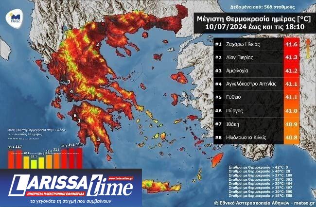 Συγκεκριμένα, η μέγιστη θερμοκρασία καταγράφηκε στη Ζαχάρω Ηλείας, φτάνοντας μέχρι και τους 41,6 βαθμούς Κελσίου.