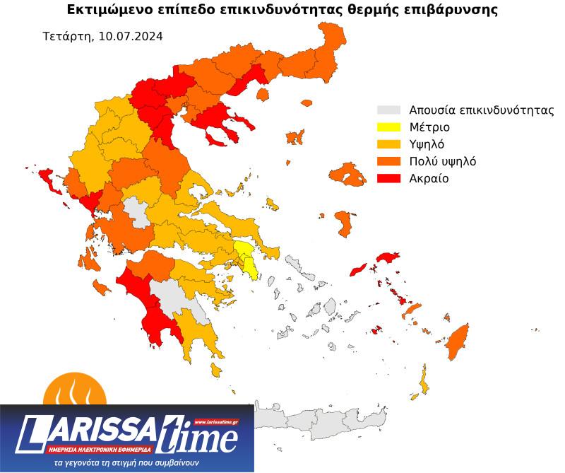 Σύμφωνα με τις τελευταίες διαθέσιμες εκτιμήσεις του συστήματος HEAT-ALARM, αυξημένη επικινδυνότητα λόγω θερμής επιβάρυνσης αναμένεται την Τετάρτη 10 Ιουλίου 2024 σε βόρεια, κεντρικά και δυτικά τμήματα της ηπειρωτικής και νησιωτικής Ελλάδας, όπως και σε νησιά του Ανατολικού Αιγαίου.