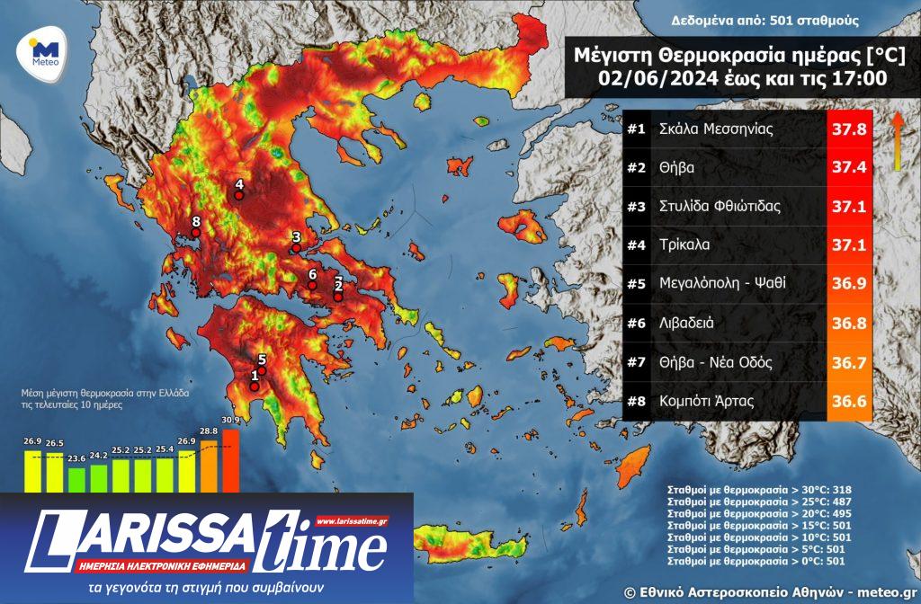 Ακολούθησε η Θήβα με 37,4 °C, η Στυλίδα με 37,1 °C, τα Τρίκαλα με 37,1 °C, η Μεγαλόπολη – Ψαθί με 36,9 °C, η Λιβαδειά με 36,9 °C η Θήβα – Νέα Οδός με 36,7 °C και το Κομπότι Άρτας με 36,6 °C.