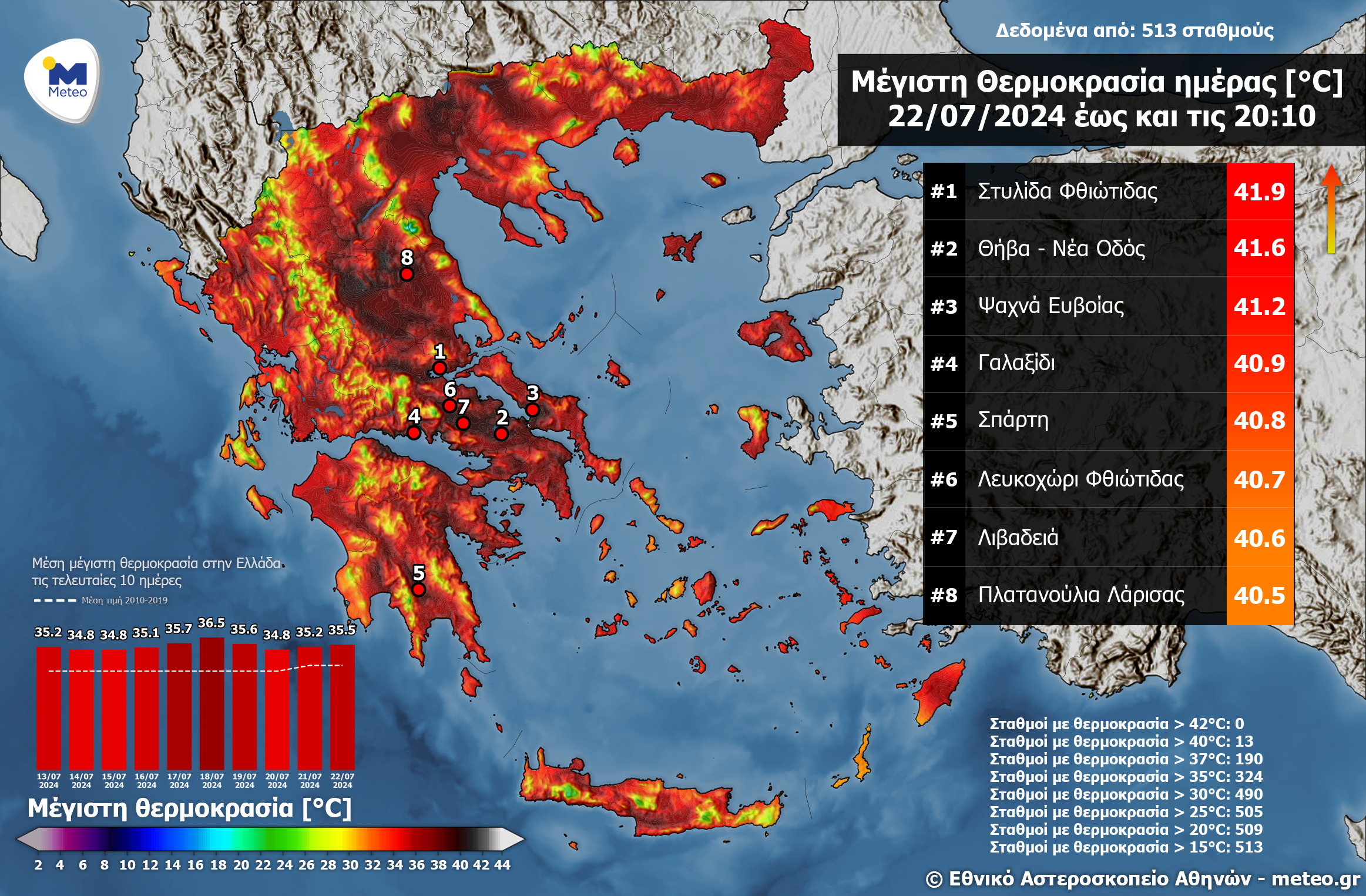Όπως προκύπτει από τις σχετικές πληροφορίες που επίσης παρουσιάζονται στην εικόνα αυτή, η θερμοκρασία ξεπέρασε τους 37 °C σε 189 από τους 513 επί του παρόντος ενεργούς σταθμούς (ποσοστό ~37%) ενώ η μέση μέγιστη θερμοκρασία ήταν ίση με 35.5 °C, τιμή υψηλότερη αυτής της 20/07 (34.8 °C) και της 21/07 (35.2 °C).