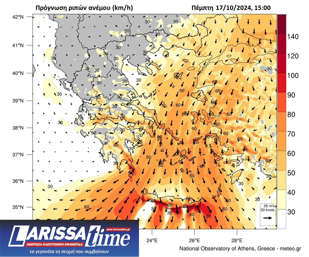 Στον προγνωστικό χάρτη που ακολουθεί παρουσιάζεται η πρόγνωση για τις ριπές ανέμου μετά το μεσημέρι της Πέμπτης. Όπως φαίνεται, αναμένονται ριπές ανέμου που τοπικά θα ξεπερνούν τα 90 km/h.