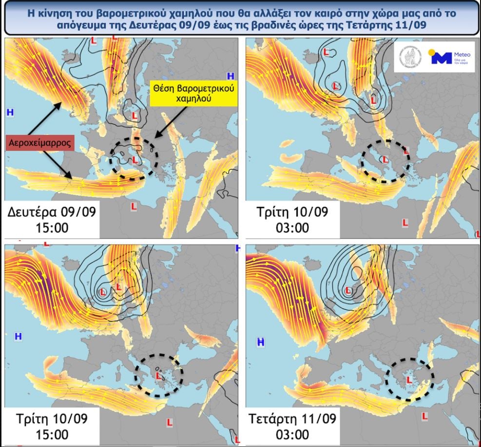 Σύμφωνα με τα νεότερα προγνωστικά στοιχεία του meteo.gr/Εθνικού Αστεροσκοπείου Αθηνών βροχές και καταιγίδες αναμένονται σε μεγάλο μέρος της χώρας έως τις βραδινές ώρες της Τετάρτης 11/09. Κύρια αιτία για αυτή την αλλαγή του καιρού είναι η μεταβολή της ατμοσφαιρικής κυκλοφορίας πάνω από την Ευρώπη καθώς και η θέση του αεροχειμάρρου (πορτοκαλί αποχρώσεις στην Εικόνα 1) πάνω από τη Μεσόγειο η οποία έχει συμβάλει στην ανάπτυξη ενός βαρομετρικού χαμηλού πάνω από την περιοχή της Ιταλίας (Εικόνα 1). Υπενθυμίζουμε ότι, ο αεροχείμαρρος είναι ένα ισχυρό ρεύμα αέρα σε ύψος περίπου 10-11 χιλιομέτρων από την επιφάνεια της γης με κίνηση κατά βάση από τα δυτικά προς τα ανατολικά και η κίνηση του καθορίζει την δημιουργία και τη κίνηση των βαρομετρικών συστημάτων. Η ανατολική-νοτιοανατολική κίνηση του βαρομετρικού χαμηλού από την περιοχή της Ιταλίας προς τα Νότια Βαλκάνια και τη χώρα μας κατά τη διάρκεια της Δευτέρας 09/09 θα έχει ως αποτέλεσμα την σταδιακή αλλαγή του καιρού από τα δυτικά της χώρας μας με βροχές και καταιγίδες.