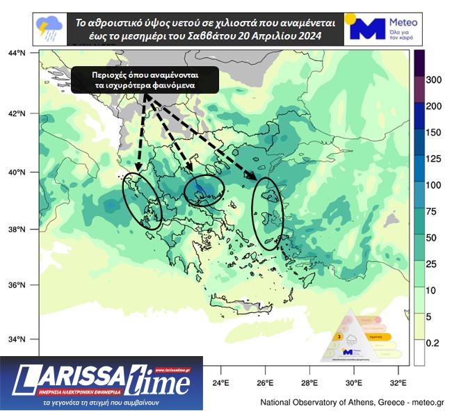 Σύμφωνα με την κατηγοριοποίηση των επεισοδίων βροχόπτωσης (Regional Precipitation Index), η οποία εφαρμόζεται από τη μονάδα Meteo του Εθνικού Αστεροσκοπείου Αθηνών, το επεισόδιο βροχόπτωσης για την Παρασκευή 19/04 κατατάσσεται στην Κατηγορία 3 (Σημαντική). Στον χάρτη που ακολουθεί παρουσιάζεται το αθροιστικό ύψος υετού σε χιλιοστά που αναμένεται έως το μεσημέρι του Σαββάτου 20/04.