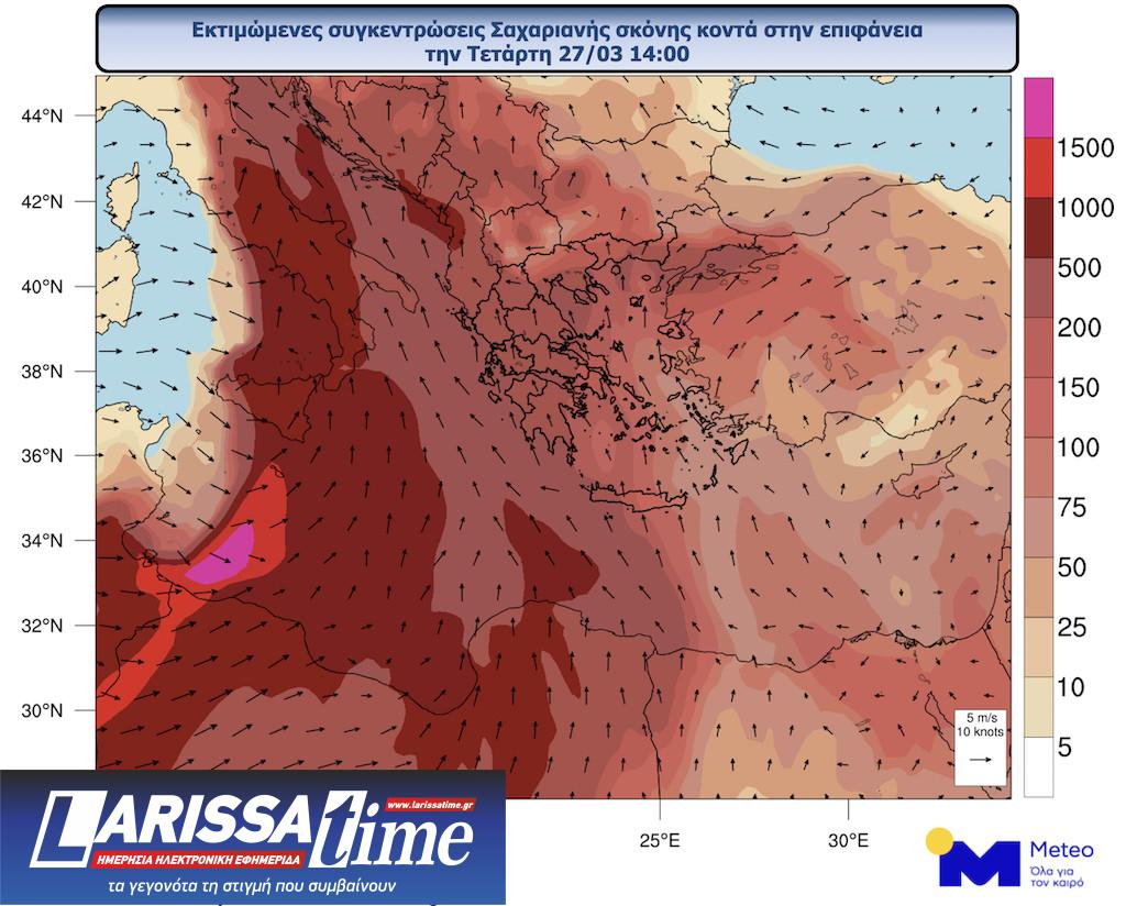 Στους πίνακες χαρτών παρουσιάζονται οι συγκεντρώσεις σκόνης κοντά στην επιφάνεια στις 14:00 της Τετάρτης 27/03 και 02:00 της Πέμπτης 28/03.
