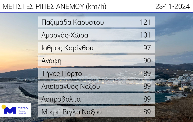 Σύμφωνα με το meteo, το Σάββατο (23/11) επικράτησαν ισχυροί έως θυελλώδεις άνεμοι στο Αιγαίο. Οι αρχικά νότιοι άνεμοι στράφηκαν σε βόρειους κατά τη διάρκεια της ημέρας. Η ισχυρότερη ριπή έως τις 19:00 περίπου καταγράφηκε στην Παξιμάδα Καρύστου και ήταν ίση με 121 χλμ/ώρα.