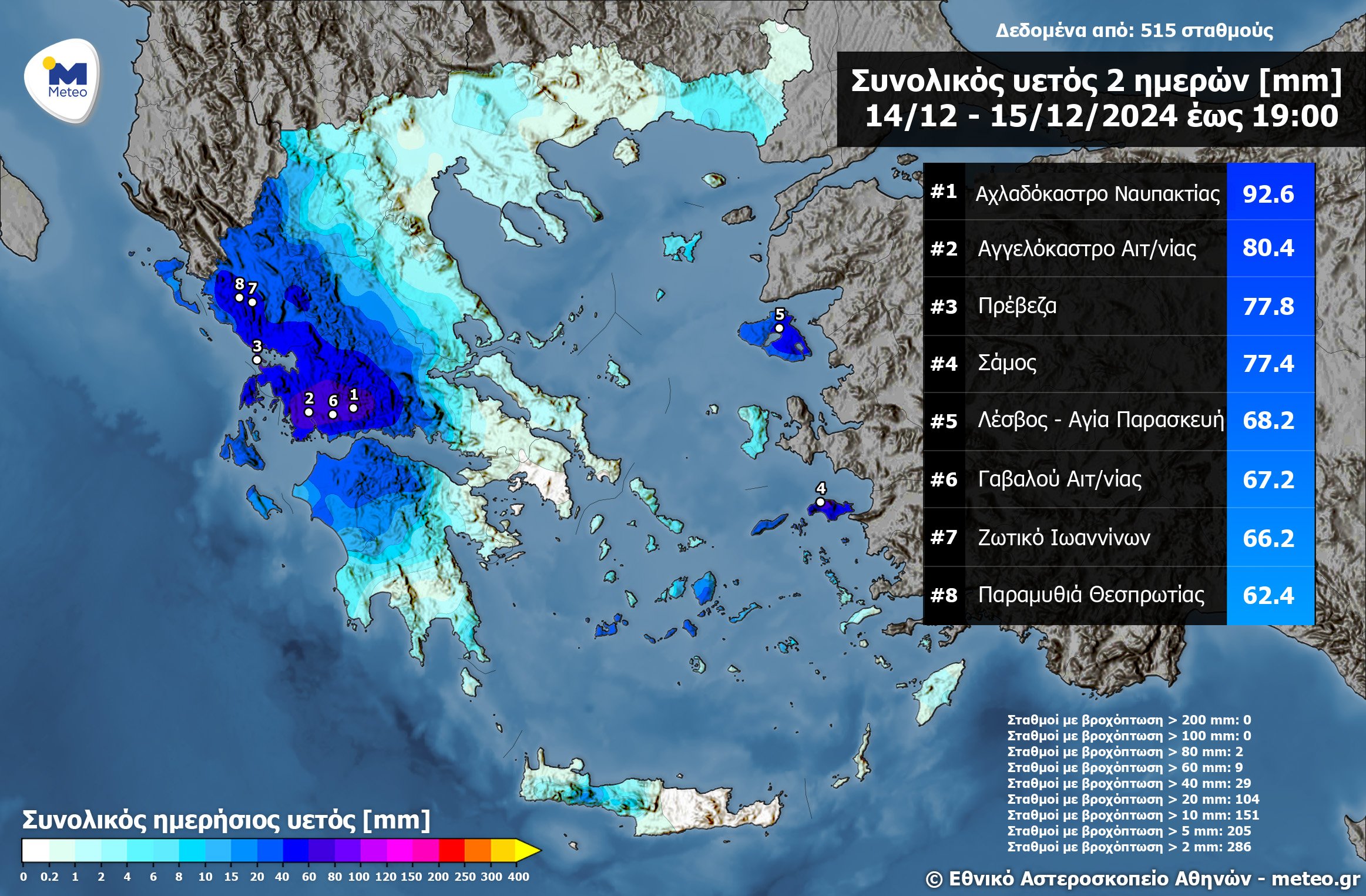 Το μεγαλύτερο ύψος βροχής από το Σάββατο 14/12 έως τις απογευματινές ώρες της Κυριακής 15/12, σημειώθηκε στο Αχλαδόκαστρο Ναυπακτίας με 92.6 mm.